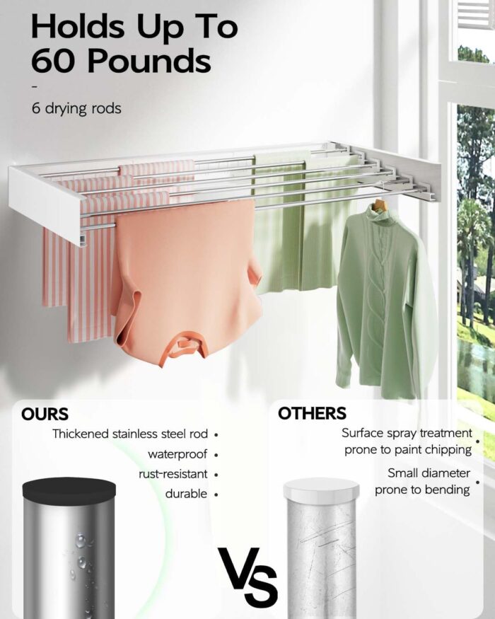 • 【Versatile Upgrade, Heavy Duty & Sturdy】Our wall drying rack update with 12 hooks for easy hanging of clothes,socks,underwear,tank tops,5 drying rods of the drying rack clothing wall mounted are made from premium stainless steel,thicker and robust,no bending or deformation.60lbs Capacity.Compact yet functional.