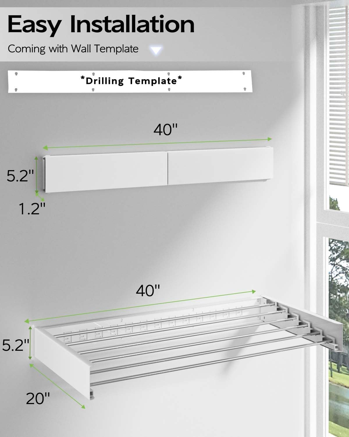 • Stylish Appearance: The appearance of the folding drying racks for laundry is sleek and stylish, adding a touch of sophistication to your home's ambiance. VIKAQI clothes rack drying comes pre-assembled and only requires drilling and installation onto the wall to be ready for use. It includes a cardboard template that makes installation really easy.
